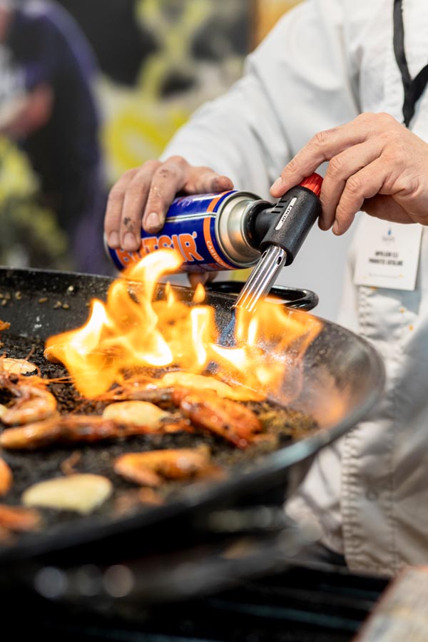 Among stands filled with local producers, tastings, and conversations about locally sourced products, Rosich stepped into the demonstration area without much protocol, sharing a relaxed moment with the audience. Within minutes, he already had a paella pan over the fire.